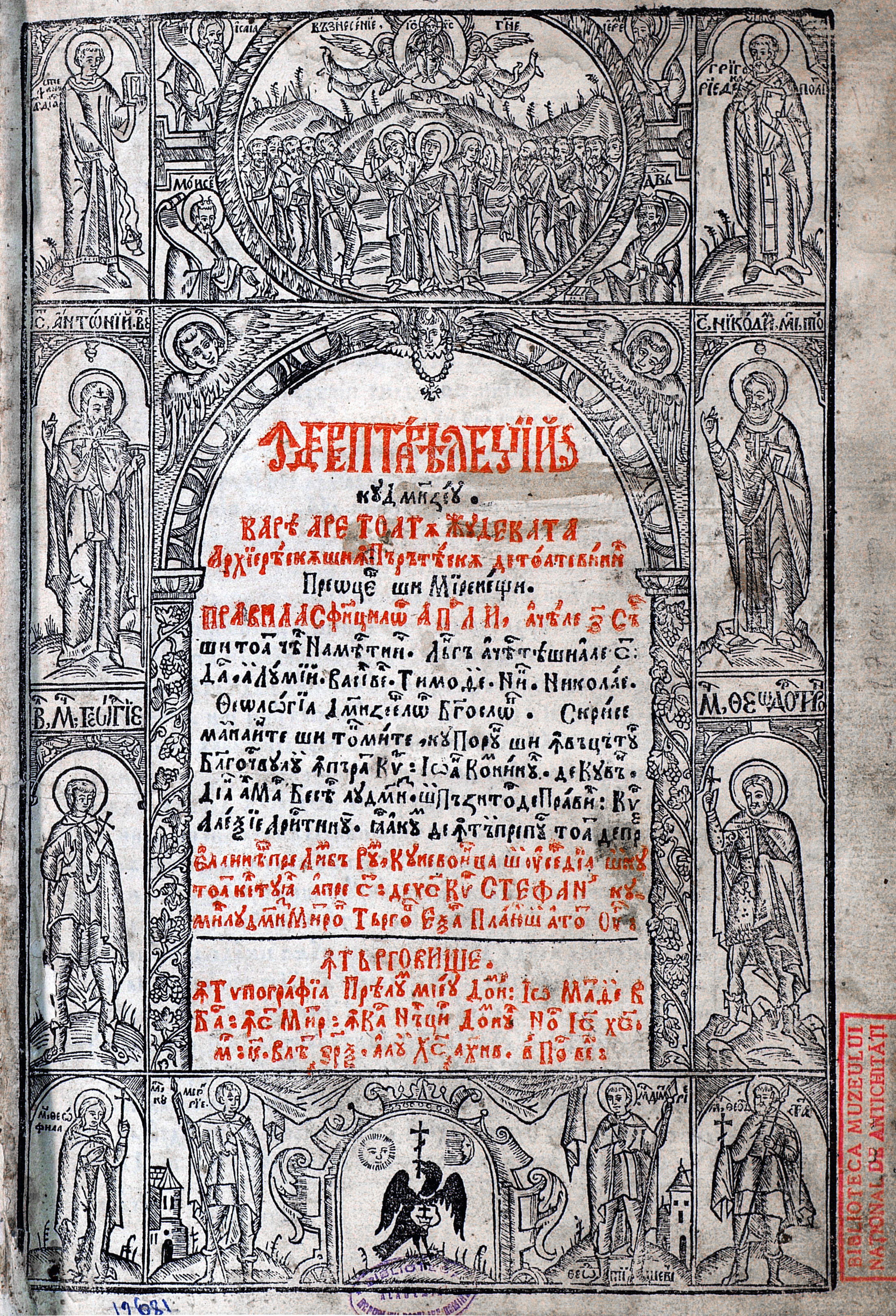 Prima pagină din Îndreptarea Legii sau Pravila cea Mare a lui Matei Basarab, publicată în 1652. Sursa: dacoromanica