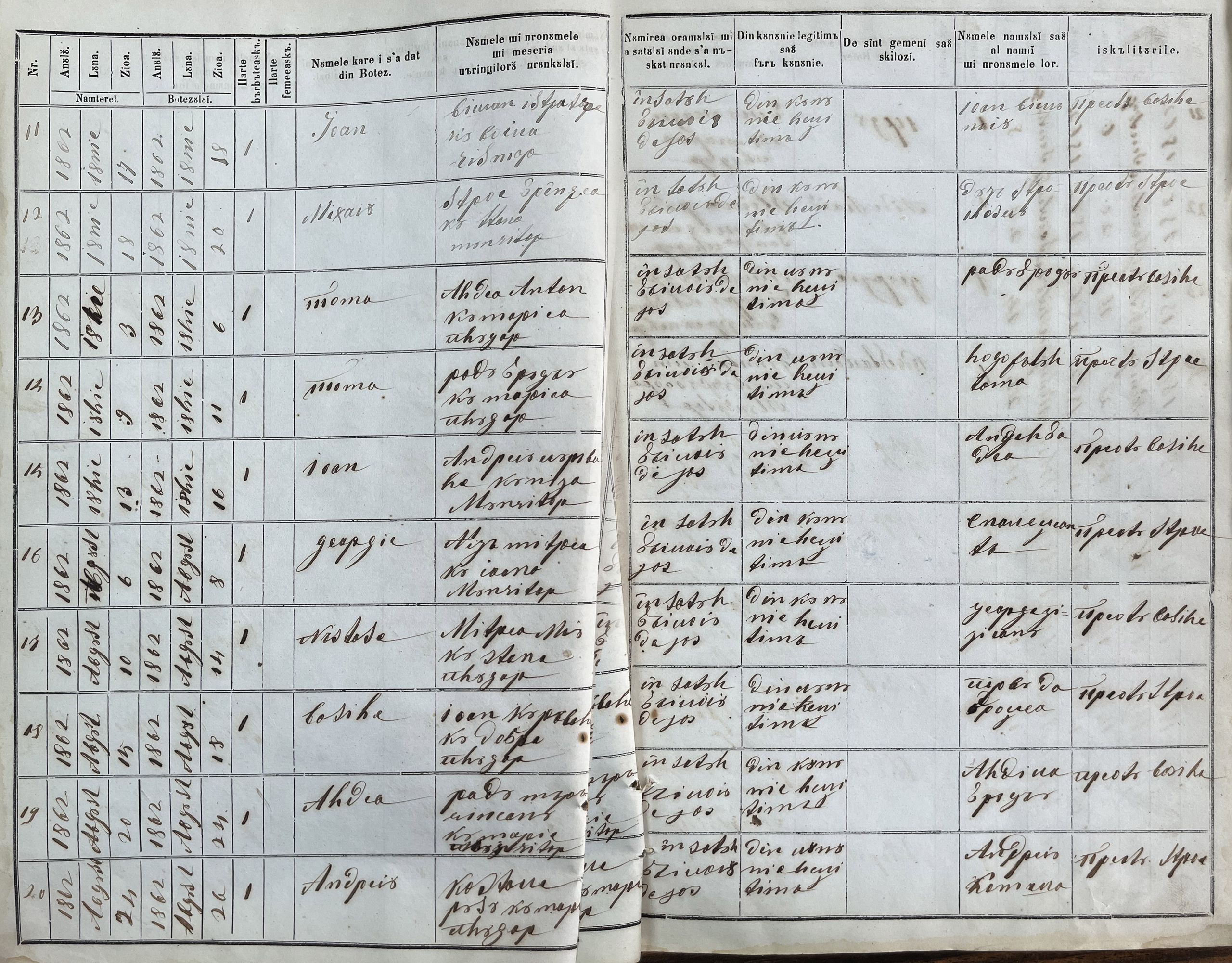 Pagini din registrul parohial pentru botezuri din satul Băicoi de Jos, județul Prahova, din anul 1862