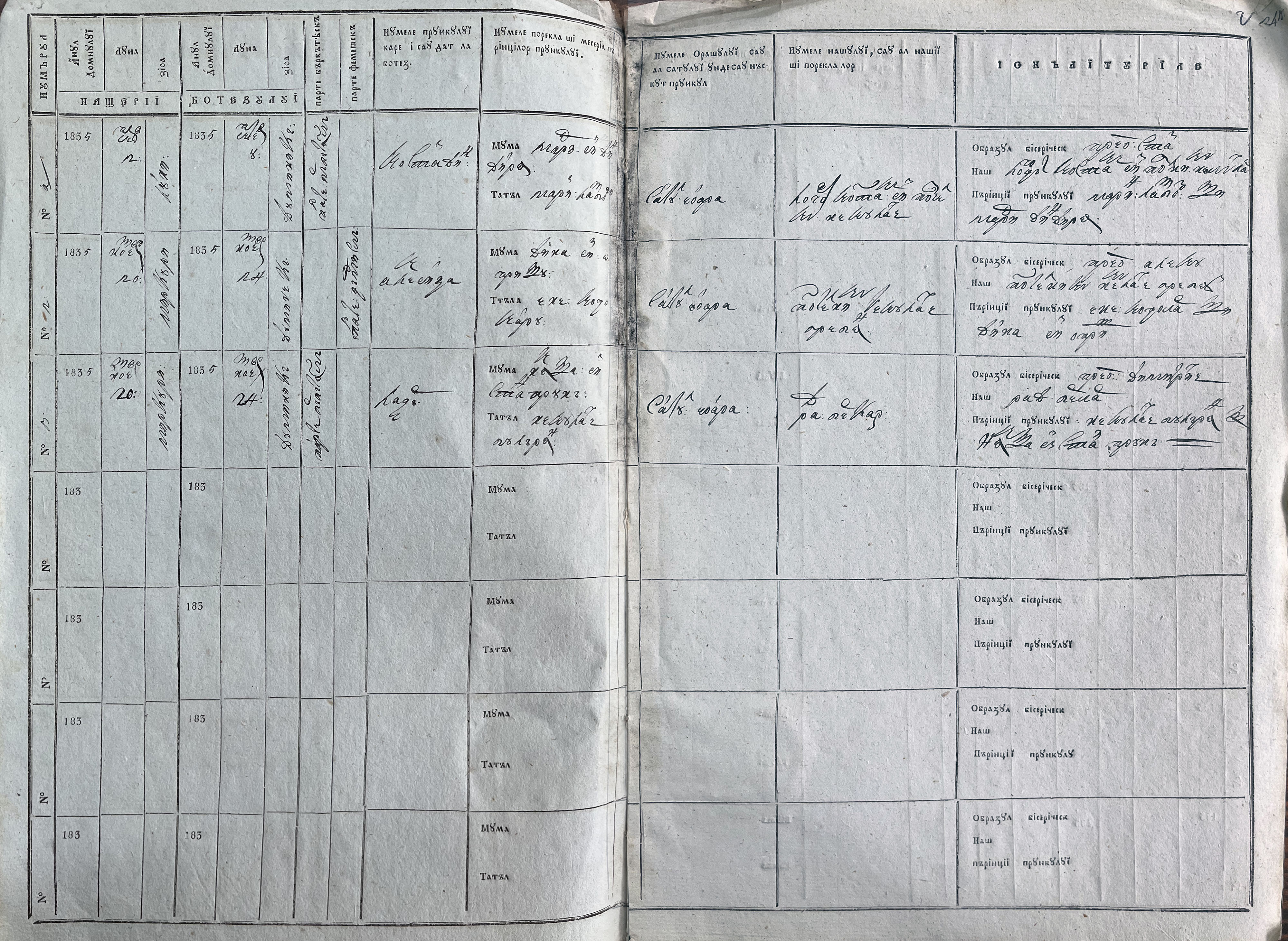 Pagini din registrul parohial pentru botezuri din satul Cioara, județul Prahova, din anul 1835.