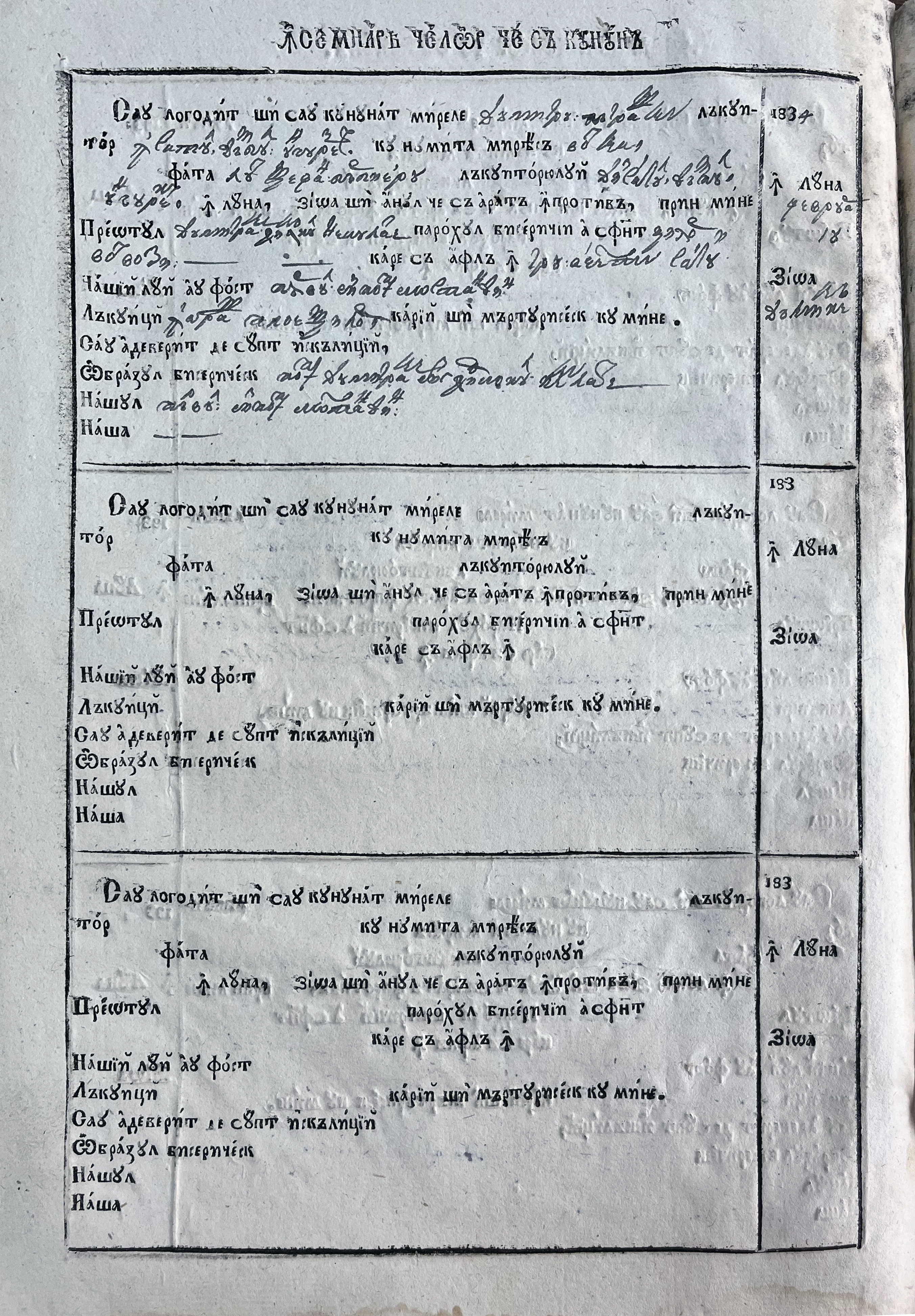Pagină din registrul parohial pentru cununii din satul Dâmbu Ungureni, județul Prahova, pe anul 1834