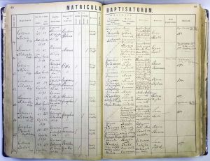 | Numărul curent | Botezătorul (preotul) | Anul, ziua și luna | Domiciliul și numărul casei | Botezatul sau botezata | Genul | Religia | Născut mort | ||||